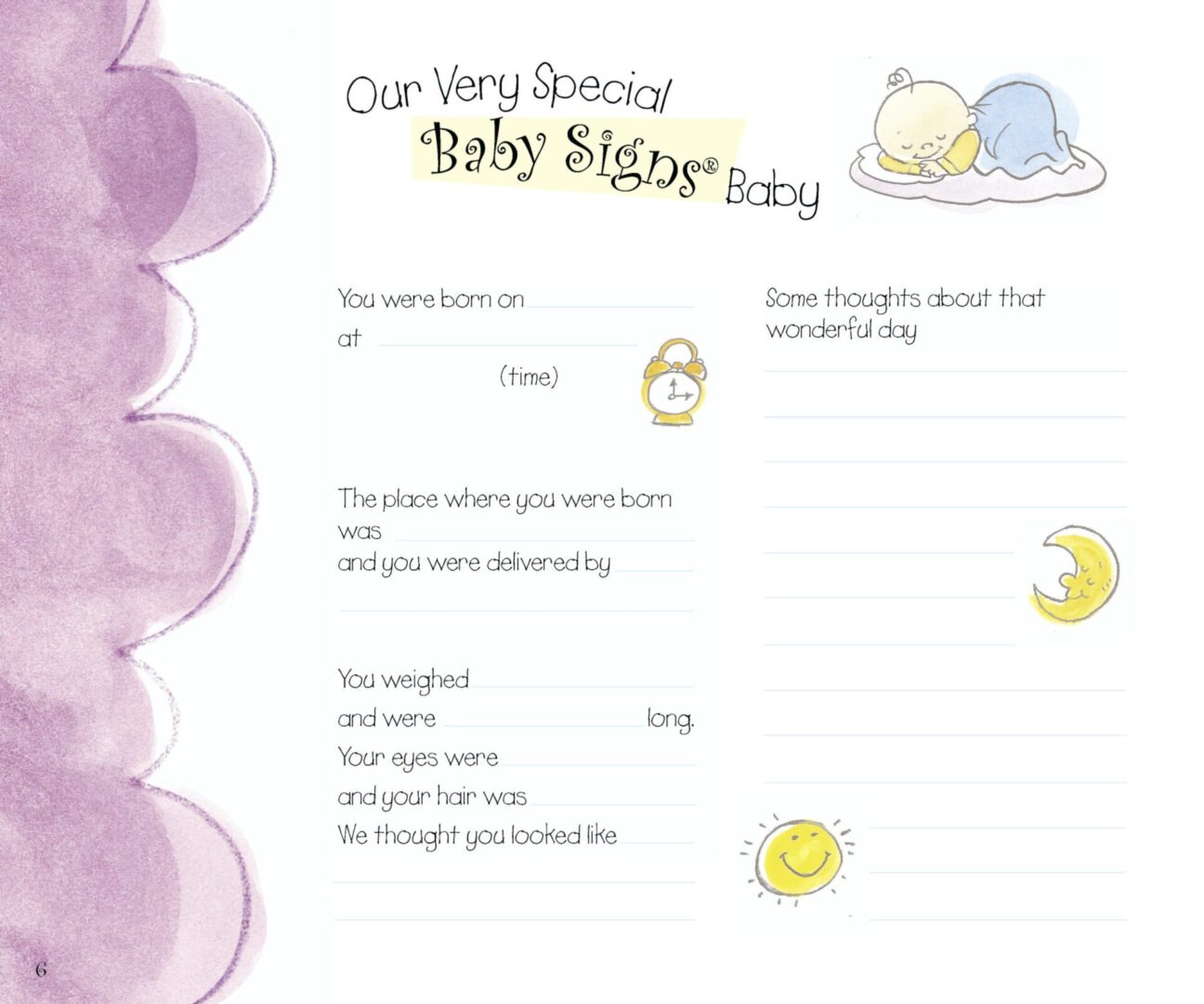 This beautifully illustrated 83-page Baby Signs® Memories Journal documents your baby’s unique journey from first signs to first words, with plenty of space for favorite photos, milestones, and special memories.